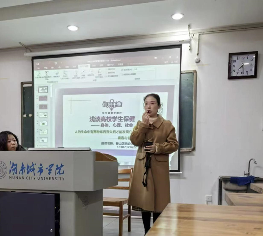 为更好的关爱女性健康,有效提升女性健康意识和健康水平,引导女性养成健康科学的生活方式2138CC太阳集团于2024年11月19号晚上在美艺楼105室召开“你好千金——女性健康中国行”女生健康公益讲座。本次讲座由益阳市赫山区妇幼保健院孕产保健部副部长兼副主任医师傅献连担任主讲。