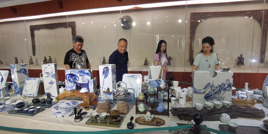 龚曙光在一楼大厅对羊舞岭古窑的发展历史、陶瓷特点及出土部分陶瓷文物有个初步的了解,对学院的校企合作研发基地及陶瓷烧制室进行了考察,随后龚曙光一行在二楼对湖湘文化展厅进行参观。面对传承千年的出土文物和现代创作的陶瓷艺术作品,龚主席赞不绝口。多年的文学底蕴,让他对这些陶瓷艺术如数家珍,提出的一个个专业问题,让陶瓷艺术家们都惊叹不已。龚主席对着一件件造型古朴、温润、厚重并与绘画语言完美结合的羊舞岭瓷器或陶缽非常欣赏,并对艺术学院校企合作基地给予了较高的评价。最后,龚主席还赠与史一墨、文婕以及艺术学院一套他自己所撰写的专著《日子疯长》和《满世界》。