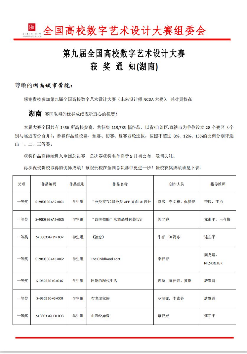 第九届全国高校数学艺术设计大赛湖南赛区评审工作近日落下帷幕。我校艺术学院和国际教育学院选送的作品在此次比赛中获得湖南赛区一等奖7项、二等奖16项、三等奖26项。(具体获奖附表)。