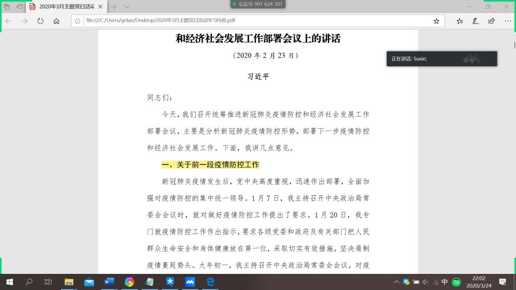 主题党日活动上,谢雨子组织全体党员学习了《习近平总书记在统筹推荐新冠肺炎疫情防控和经济社会发展工作部署会议上的讲话》、习近平总书记在湖北考察疫情防控工作时的重要讲话精神和《党委(党组)落实全面从严治党主体责任规定》、《2138CC太阳集团二级学院党组织工作主体责任清单》等重要文件,并观看相关视频。