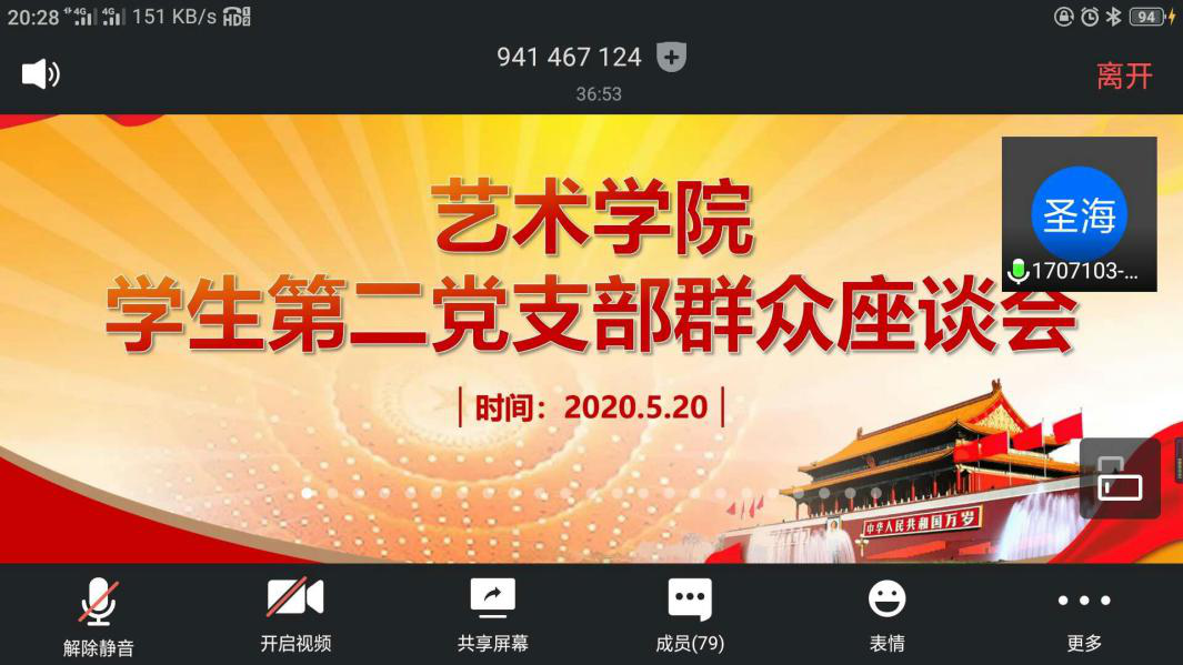 2020年5月20日晚20:00,艺术学院学生第二党支部利用腾讯会议召开了关于张文胜、刘宇飞等9位优秀入党积极分子是否列为党员发展对象的群众座谈会。参加此次会议的有本支部支委会成员、9位团支部推荐的优秀入党积极分子以及各班部分群众同学。召开此次座谈会的目的在于广泛听取群众对各位入党积极分子的意见,以便党支部更好的开展党员发展工作。