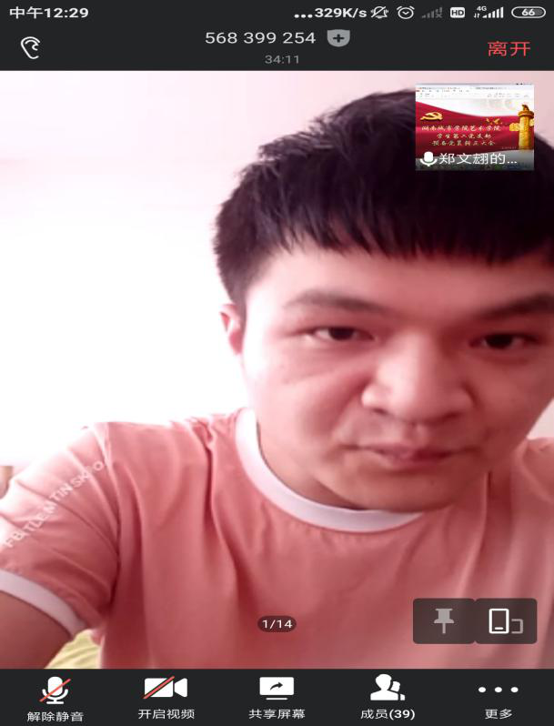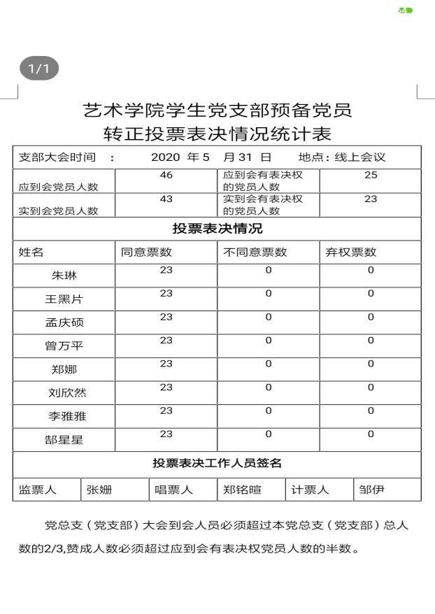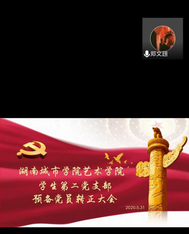 2020年5月31日中午12点,艺术学院学生第二党支部预备党员转正大会在腾讯会议线上召开。本次大会由支部副书记郑铭暄主持,主讨论了关于刘欣然等8位预备党员的转正事宜。本支部共有正式党员25名,预备党员21名。到会正式党员23名,预备党员20名。