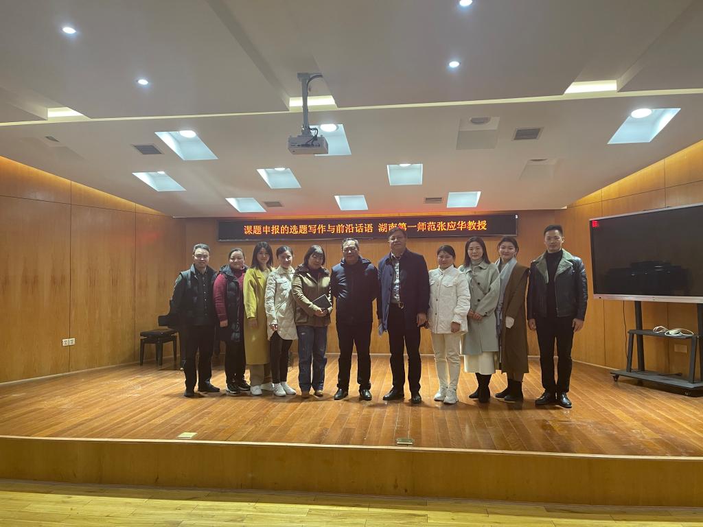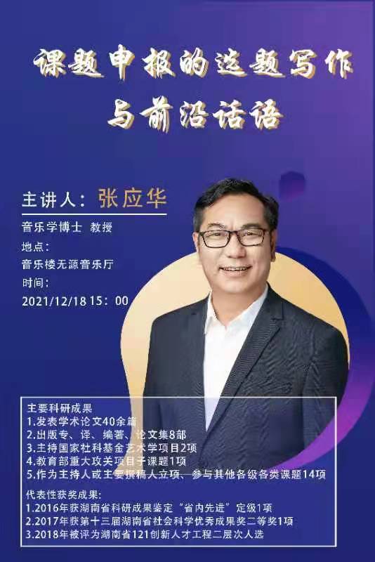 2021年12月18日下午三点,湖南第一师范音乐学院院长张应华教授受邀来我校进行题为《课题申报的选题写作与前沿话语》的学术讲座。艺术学院院长周勇、党委书记谢立新、副书记郑学达以及全体教师和部分学生代表参加了此次讲座,周勇院长代表艺术学院全体教师对张教授的到来表示热烈的欢迎,并致辞。