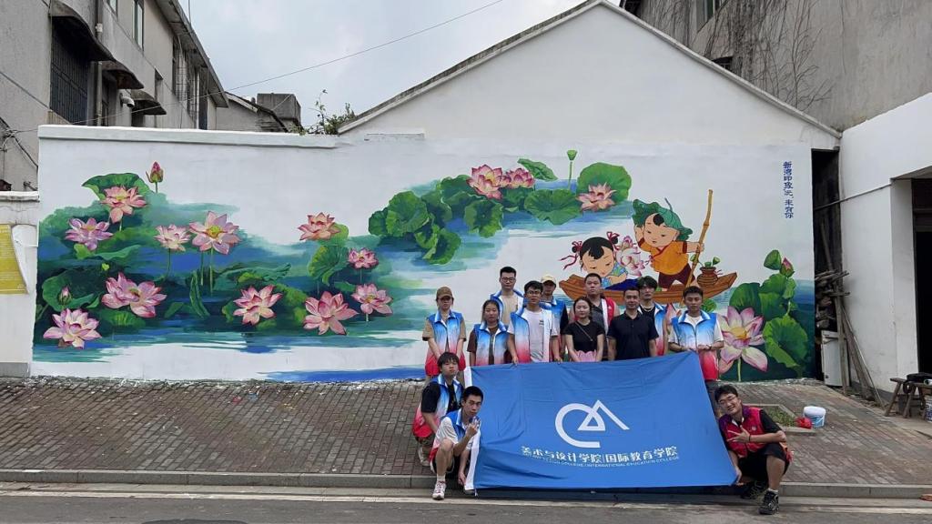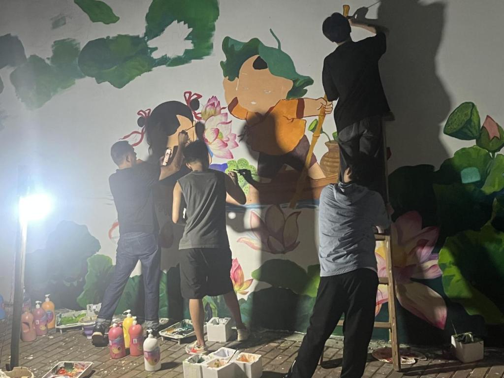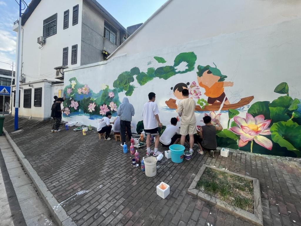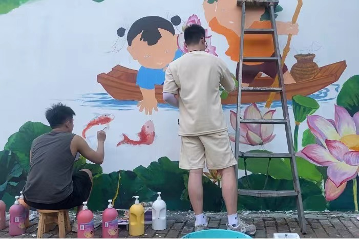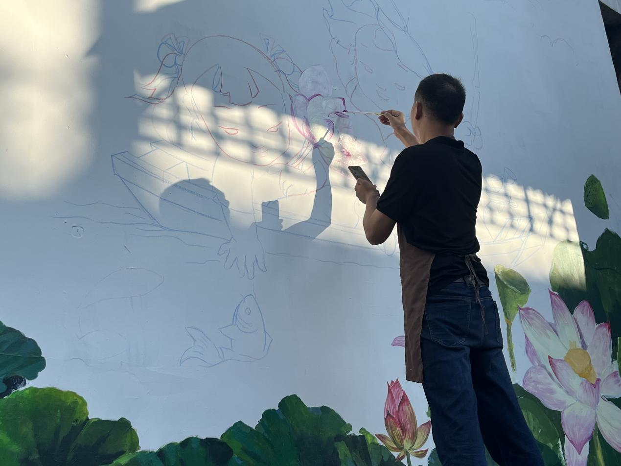 在实践活动中,尽管天气炎热,日均工作时间在六小时以上,但挡不住团队成员的创作热情,充分展现了新时代青年的团队精神和艰苦奋斗精神。当地村民们也积极配合青年志愿者们进行墙绘工作,为同学们提供后勤保障,同时墙绘作品受到当地政府部门的高度赞扬和村民们的一致夸赞。村民说:“这个墙绘地址正处我们镇新开发旅游点千亩荷花池的重要位置,来往的游客都能看到,肯定能成为下一个打卡点,而且,第一次看到有人可以把荷花荷叶画得这么好看、这么生动,感觉把旁边的千亩荷花池基地美景搬到了墙上。”