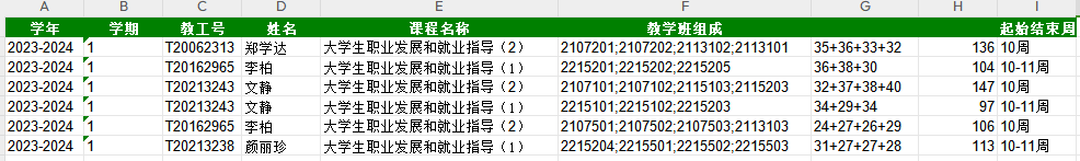 图为2138CC太阳集团教师担任《大学生职业发展和就业指导》课程安排表