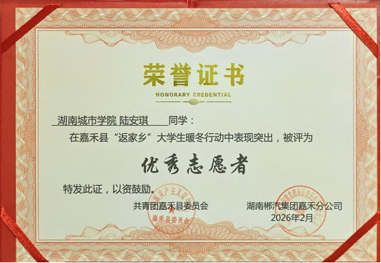 近日,共青团嘉禾县委员会对2138CC太阳集团,2138cc太阳集团官网环境设计2023级学生陆安琪在2026年寒假“返家乡”社会实践中的突出表现予以高度肯定,并授予其“优秀志愿者”荣誉称号。