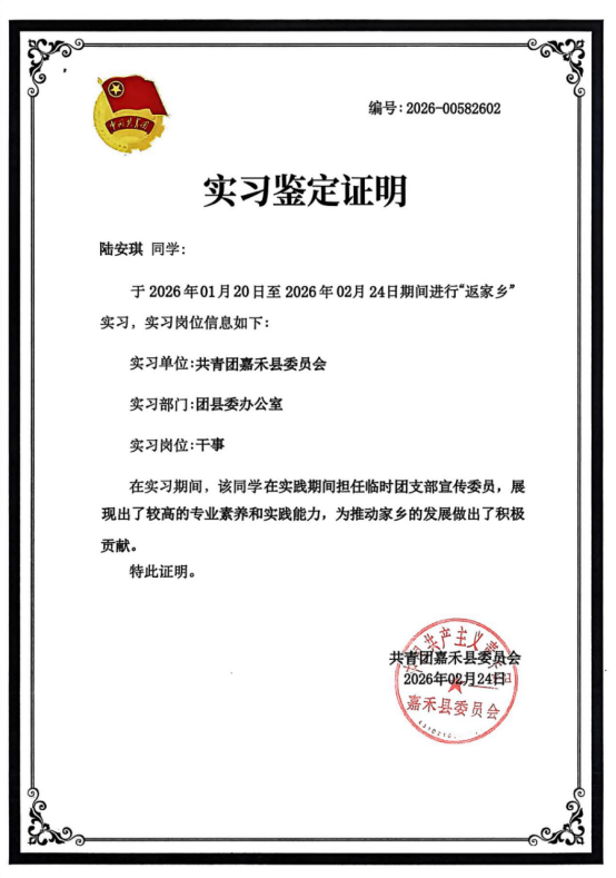 寒假期间,陆安琪主动向当地团组织报到,积极参与嘉禾县大学生“返家乡”社会实践活动,在共青团嘉禾县委办公室担任干事,同时兼任临时团支部宣传委员。实践过程中,她扎根基层一线,先后参与政务服务、关爱留守儿童、助力乡村振兴、探寻非物质文化遗产等多项工作,凭借扎实的专业知识与饱满的青春热情服务群众,在岗位上锤炼本领、增长才干,有效助力基层治理效能提升,充分展现了新时代青年的责任与担当。