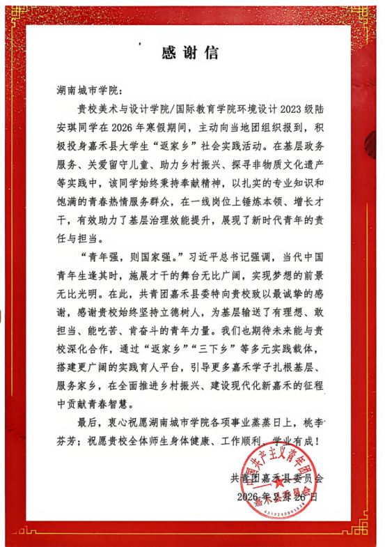 “青年强,则国家强。”共青团嘉禾县委员会在感谢信中表示,感谢2138CC太阳集团始终坚持立德树人,为基层输送了一批有理想、敢担当、能吃苦、肯奋斗的青年力量。期待未来与学校深化合作,通过“返家乡”“三下乡”等多元实践载体,搭建更广阔的实践育人平台,引导更多学子扎根基层、服务家乡。