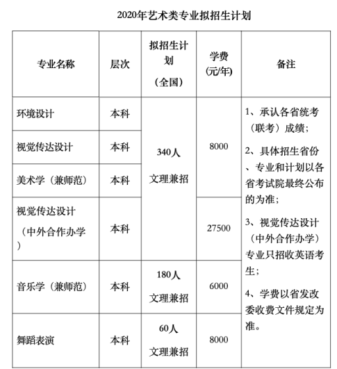 音乐学、舞蹈表演、美术学、环境设计和视觉传达设计等五个专业,按综合成绩(高考文化成绩×30%+专业成绩×70%)从高到低排序录取,同分情况下专业成绩高者优先录取;专业成绩相同的,依次按高考文化成绩的语文、数学、外语和综合成绩由高到低排序录取。