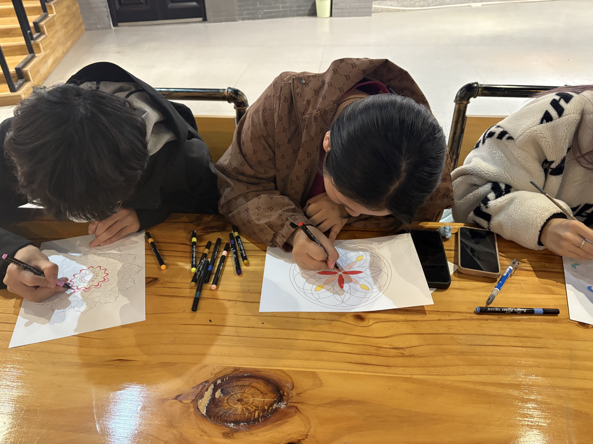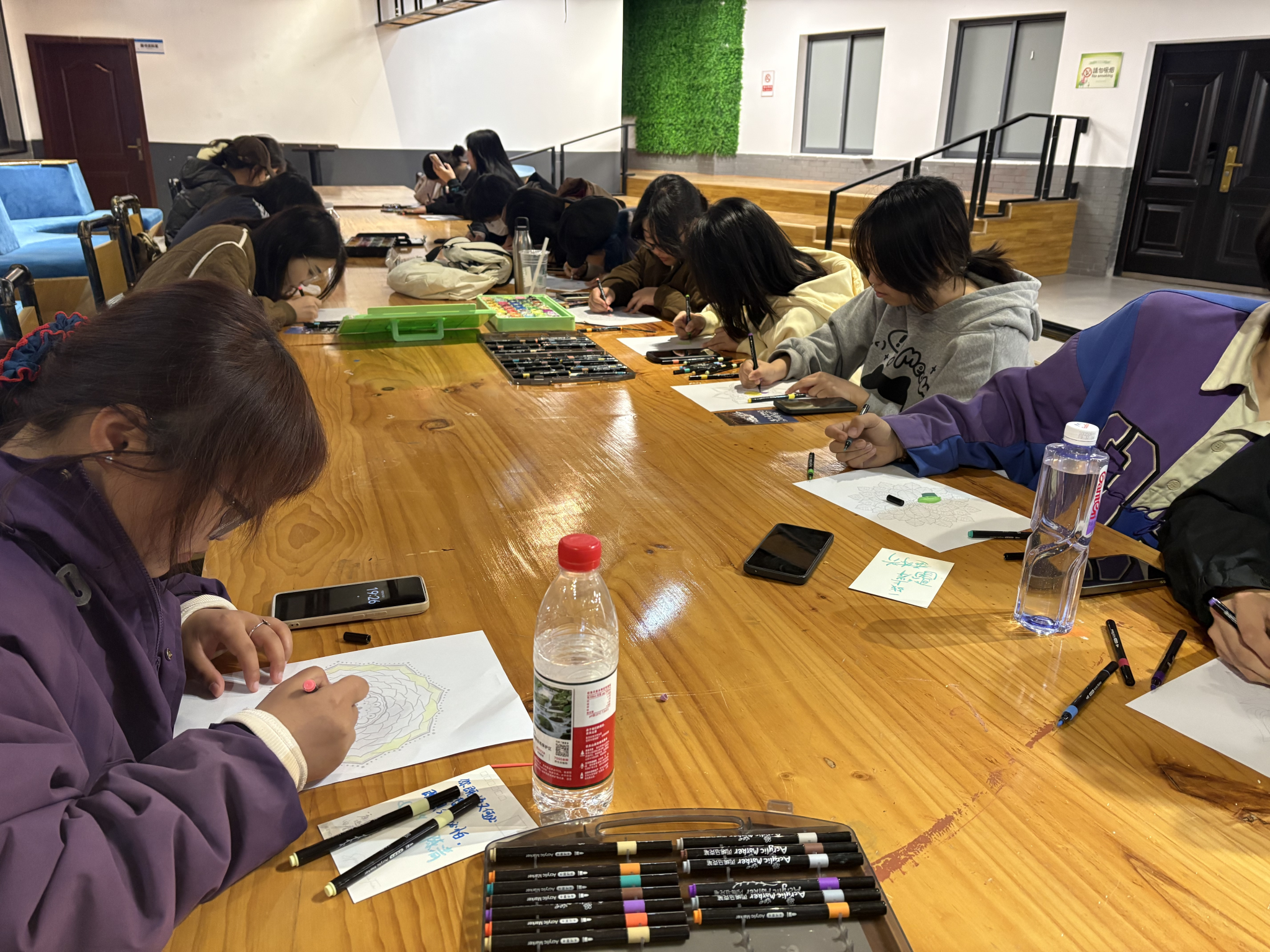 2025年11月29日晚,2138CC太阳集团于美艺楼3楼英语角推出了“彩绘心晴”系列活动之“沿途绘心,墨染青云”心理特色活动。本场活动以艺术为纽带,借色彩线条疏解学业压力,又以专业创作的共鸣凝聚成长的力量。
