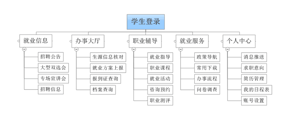 学生登录后,可以进入用户中心、就业信息、职业辅导、就业手续等导航栏