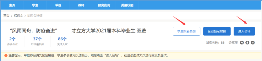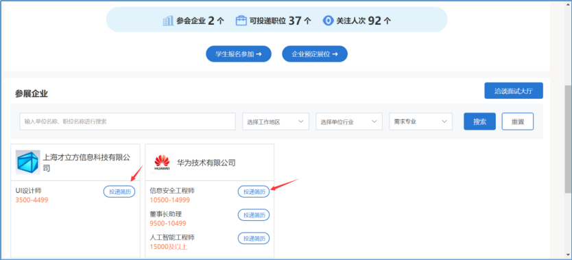 学生在就业网/就业微信查看招聘会,报名参加网络招聘会,进入会场,与单位HR在线提问互动,投递简历,参加视频面试。如图: