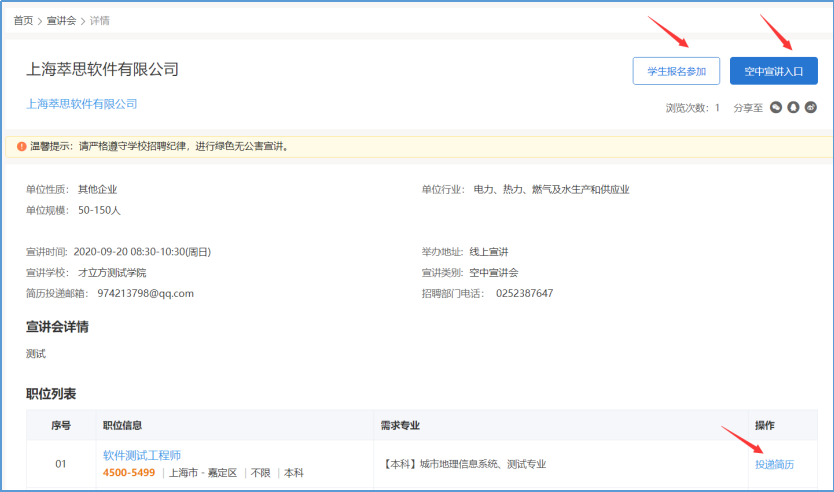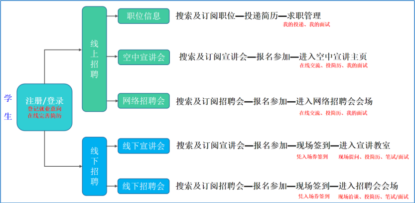 学生在就业网/就业微信查看宣讲会,报名参加线下宣讲会,系统自动发送入场券,请学生做好疫情防护措施,准备好纸质简历,按时有序参会,配合学校做好签到工作,积极投递简历,参加笔试面试。