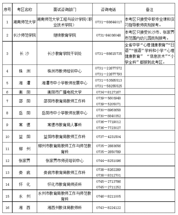 3.湖南省中小学教师资格考试面试各考区联系地址和电话如下表: