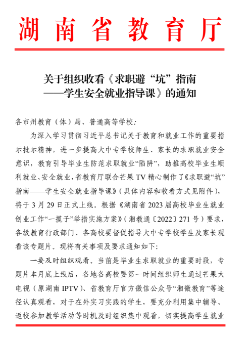 关于组织收看《求职避“坑”指南——学生安全就业指导课》的通知