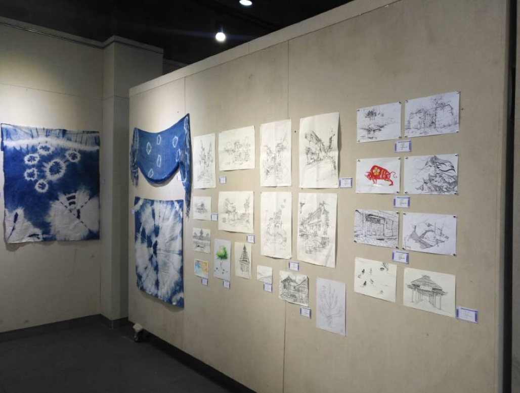 本次的同学们展览的作品主要以蜡染、扎染以及风景速写为主, 本次展览涉及到了当地少数民族民间传统纺织印染手工艺(蜡染、扎染)。
