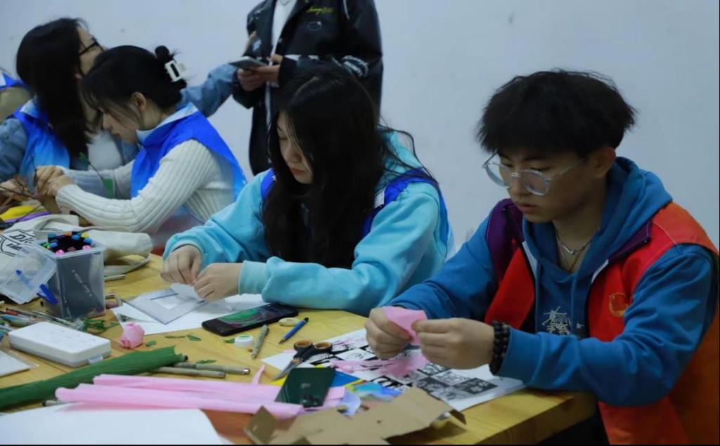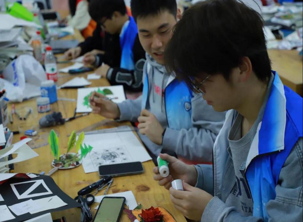 本次活动,学生们用枯树枝、卡纸和超轻粘土等制作材料,通过粘贴、裁剪、拼接等方式,运用线条、形状、色彩、肌理等造型元素,制作出了以花、树、房屋、龙等主题的作品,学生们将奇思妙想和手工创作相结合,形成了“艺术与环保的碰撞”。