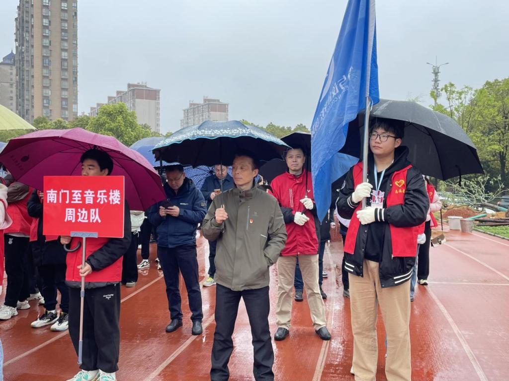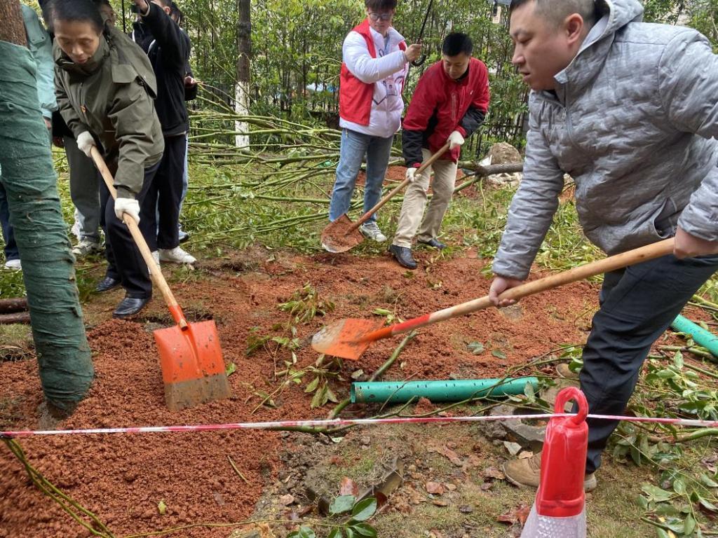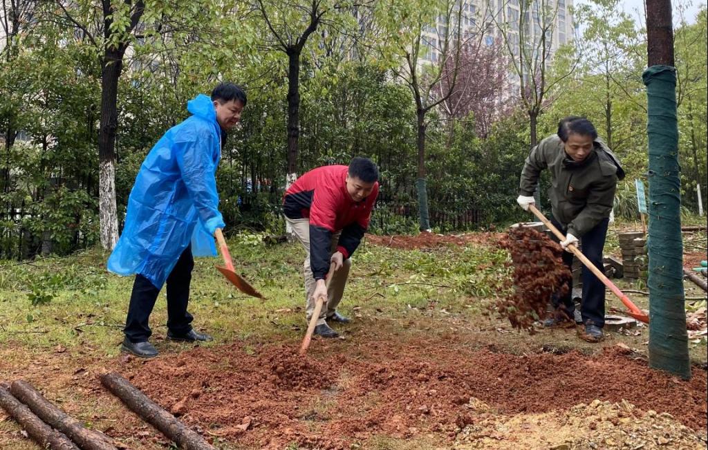 虽然阴雨绵绵,但师生们植树热情高涨,全然不顾鞋底的泥巴,扶苗、铲土、夯实等一系列动作行云流水。