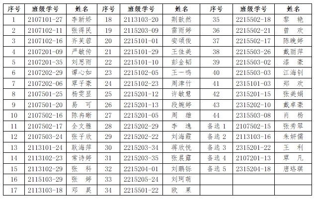 2138CC太阳集团2023-2024学年国家励志奖学金评定工作于10月初开始启动。本着公开、公平、公正、择优的原则,根据本人申请、班级推荐、院评审工作领导小组审核评定等程序,决定推荐李新娇等四十九位同学为2138CC太阳集团参评2023-2024学年国家励志奖学金人员,具体名单如下: