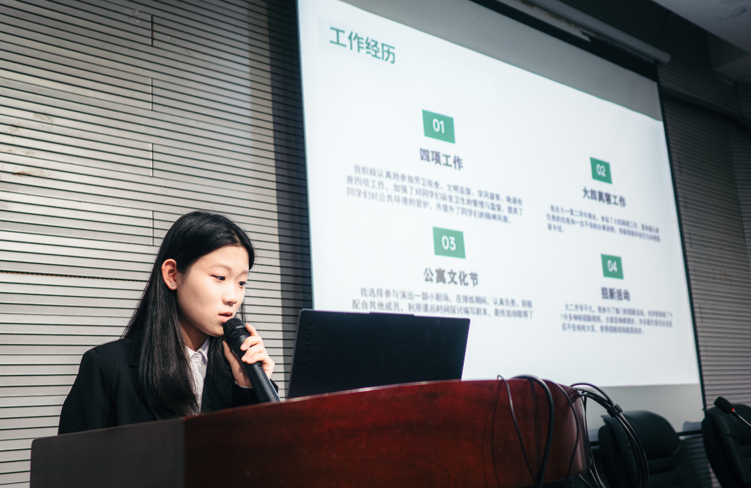 参加部长团竞选的范丽莎同学在老师提问中回答:“部长这个职务并不是简简单单一个词,需要我有强烈的责任心,认真对待宿管工作,需要我要做到及时了解,收集,反映同学们的意见和建议,它所代表的有很多,需要懂得如何正确处理委员之前的关系,如何合理分配工作,如何将老师安排的工作得到最优解,都是部长应该思考的,所以部长这个职务对于我来说分量很重。”
