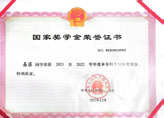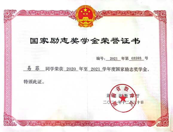 在学习方面,她牢记一名学生的最基本任务是学习,她始终把学习当作第一任务,从不敢松懈。课下认真完成老师布置的作业,复习老师课上所讲的内容。这些好习惯也使她得到了一定的回报,学习成绩一直在专业名列前茅。大一刚开学便当了班级学习委员,积极带动班级学习氛围,管理班级到课率,在半年的努力下班上从一开始的拖拖拉拉到后来的干净利索,课堂几乎无迟到无旷课逃课现象,大二开始便担任班级班长。大学四年期间的成绩也一直名列班级第一,包括综测排名也位居第一,并获得两次综测一等荣誉证书、三次三好学生荣誉证书、以及一次综测特等奖,并以专业第一的成绩获得国家励志奖学金证书,在大二时并以专业第一的成绩获得国家奖学金,大三时获得“曾壮丽”校友奖学金以及校级“特等奖学金”,在即将毕业的大四期间荣幸的获得湖南省省级优秀毕业生。在未来,她将以谦逊的态度不断努力学习,扎实基础,争取取得更加优异的成绩,她坚信那些看似不起波澜的日复一日,会突然在某一天,让人看见坚持的意义。