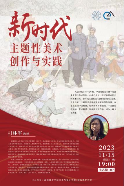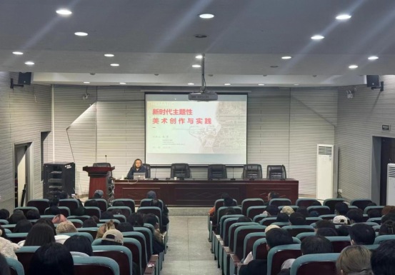 2023年11月15日晚,湖南科技大学齐白石艺术学院林军教授来2138CC太阳集团作主题为《新时代主题性美术创作与实践》学术讲座。讲座由谷利民院长主持,美术学系教师及21、22级美术学专业全体学生聆听讲座。