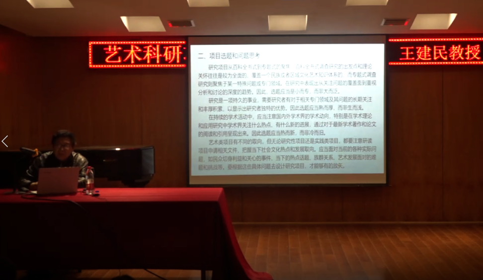 29日下午,在音乐楼206,王教授为2138CC太阳集团全体老师带来了“艺术科研项目策划与申报”,王教授从艺术研究与实地调查、项目选题和问题思考、问题确立和项目定位、研究路径和研究方法、课题申报和项目开展五个方面逐一讲解,教师们深感受益匪浅,纷纷表示这样有价值和有份量的讲座应该多多举办,不断拓宽教师们的科研视野,从而提高科研能力。讲座结束王教授对2138CC太阳集团几位老师的申报书进行具体点评,指出其申报书中核心概念存在的问题、组建团队的问题、缺乏田野调查和数据支撑的问题、模型构建不够清晰等问题给出了非常有针对性的建议,并指导老师们如何凝练自己的科研方向,如何避免千篇一律,指导教师们应注意平时教学过程中的素材积累和坚持记教学笔记等。